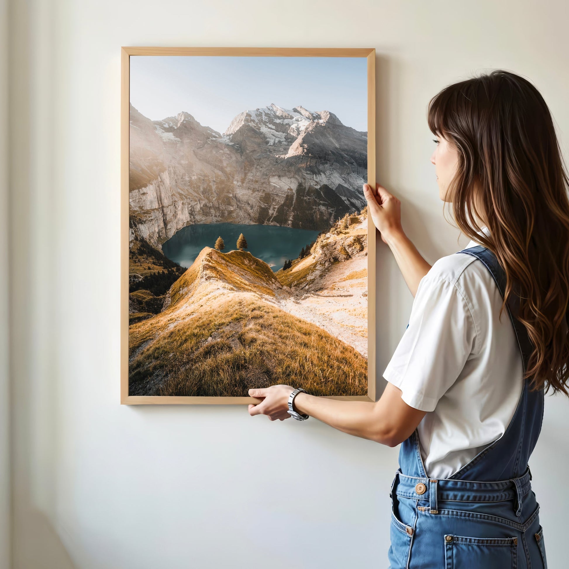 Golden light over Oeschinensee’s alpine meadows—bring the Swiss Alps home.