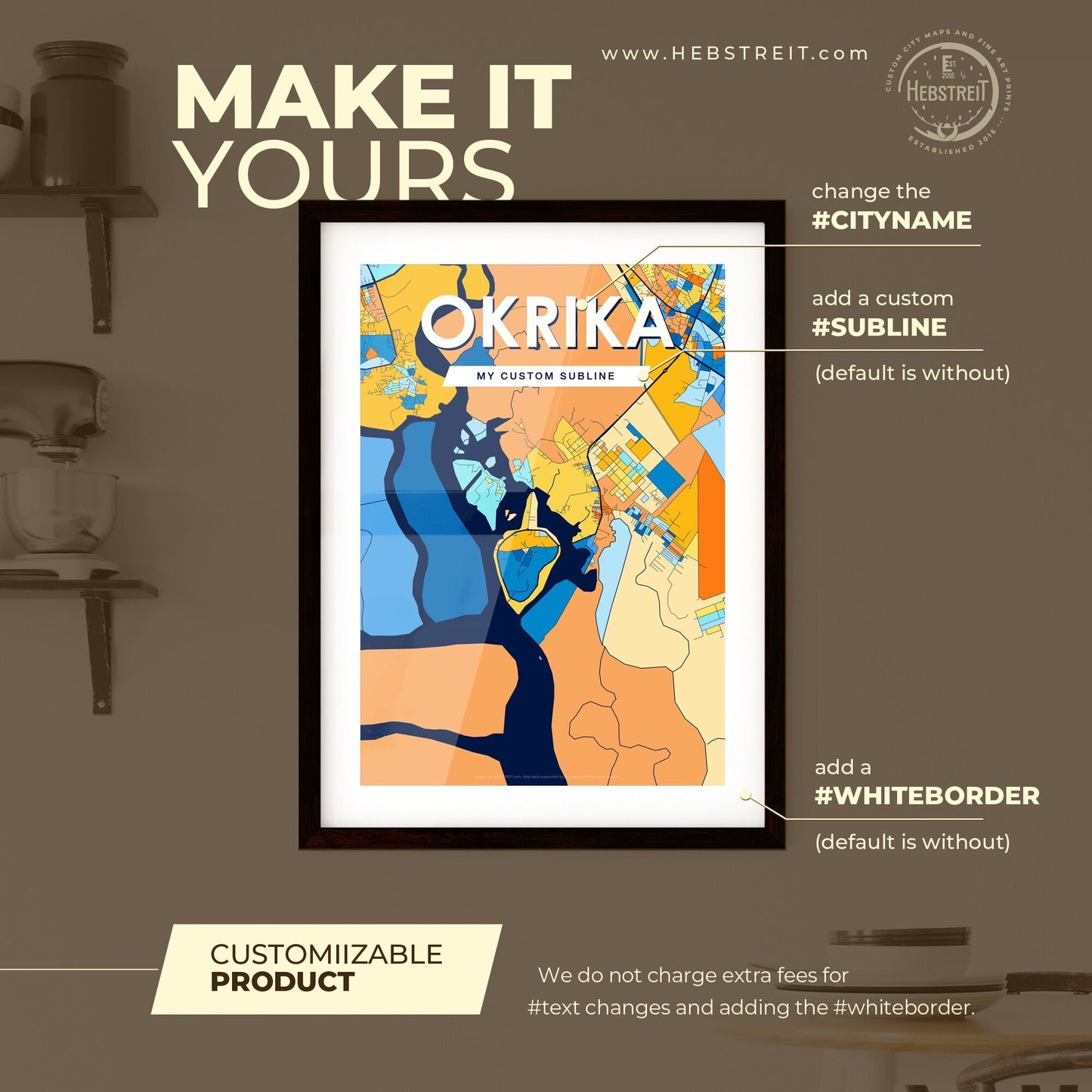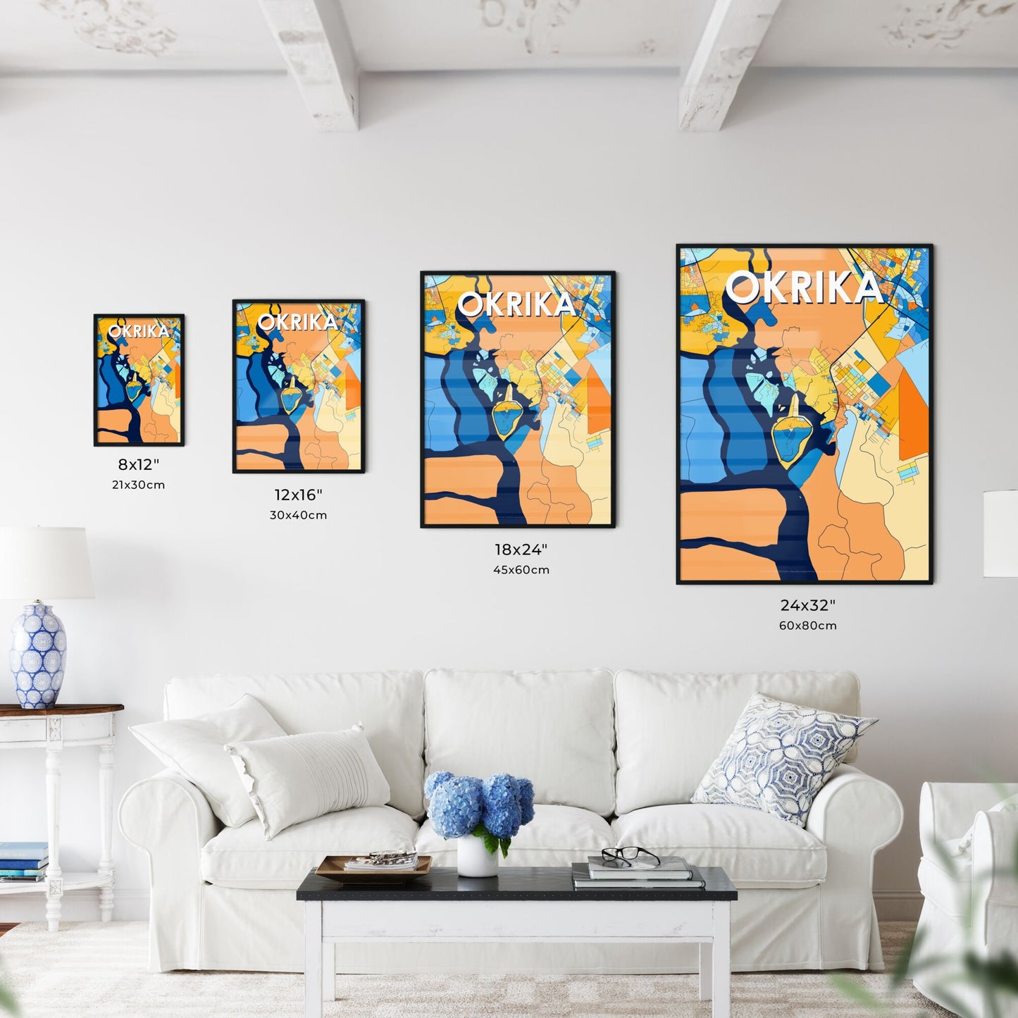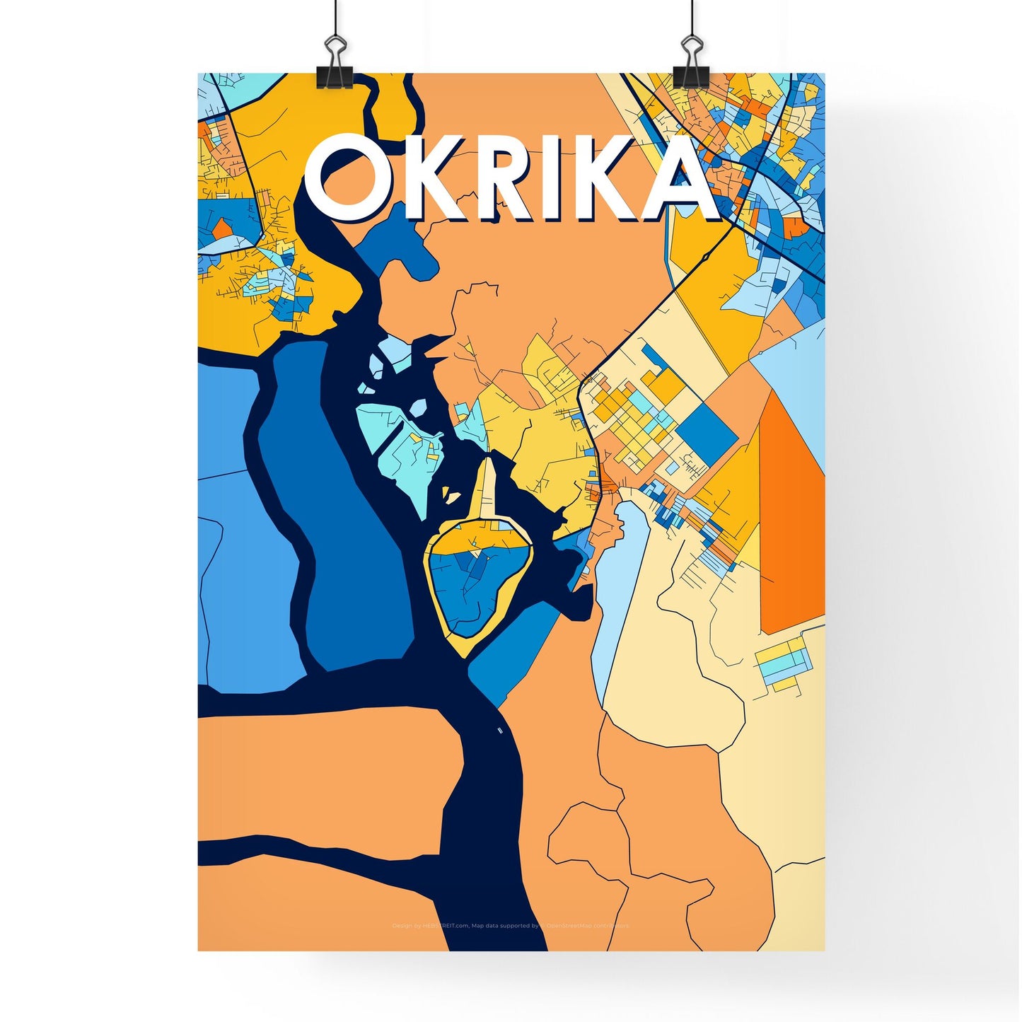 Crafted with a keen eye for detail, this map includes the major thoroughfares and neighborhoods, highlighted with a striking color palette of blues, oranges, and yellows that contrast sharply against the dark blue representing the adjacent water body. The city's name OKRIKA is prominently displayed in bold, white lettering at the top, making it an unmistakable tribute to this beloved location.