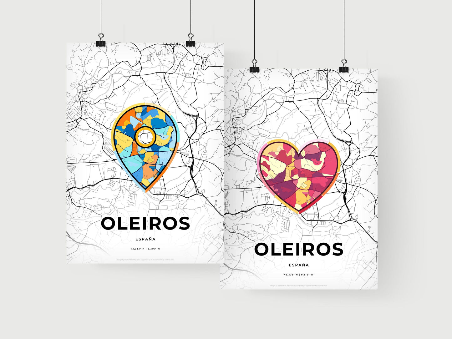 Our map of Oleiros España shows minimalist designed roads, railroads and waterways combined with colorful urban areas within one icon.