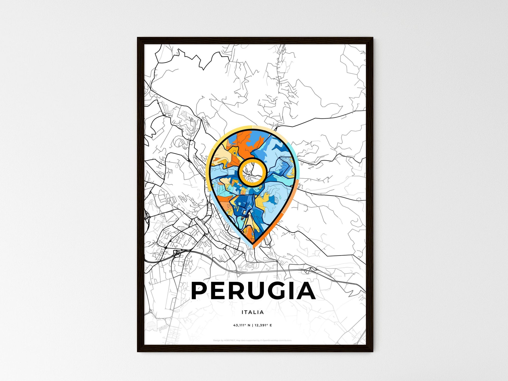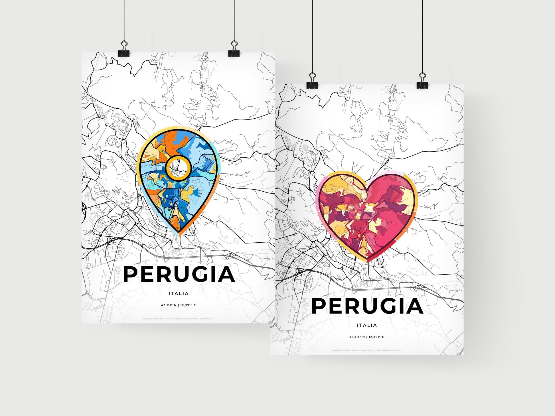 Our map of Perugia Italia shows minimalist designed roads, railroads and waterways combined with colorful urban areas within one icon.