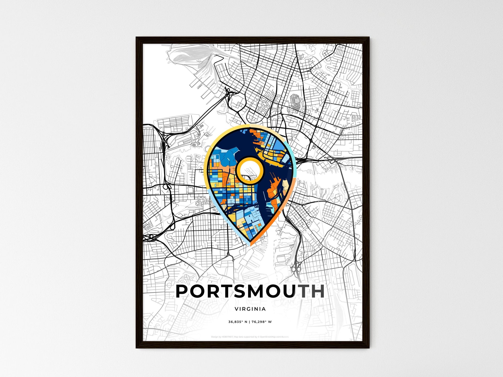 Immerse yourself in the vibrant history and coastal charm of Portsmouth, Virginia, depicted in this captivating abstract art map. As the birthplace of the United States Navy, Portsmouth boasts a rich maritime heritage with iconic landmarks like the USS Wisconsin battleship. Explore the bustling waterfront, lined with charming shops and restaurants overlooking the Elizabeth River. Stroll through the historic Churchland neighborhood, where Victorian homes whisper tales of the past. Discover vibrant arts and culture at the Children's Museum of Virginia and the Portsmouth Art & Cultural Center. This minimalist map is a unique tribute to Portsmouth's rich tapestry, capturing its essence with colorful icons and an artistic flair, making it a perfect gift or a stunning addition to any home.