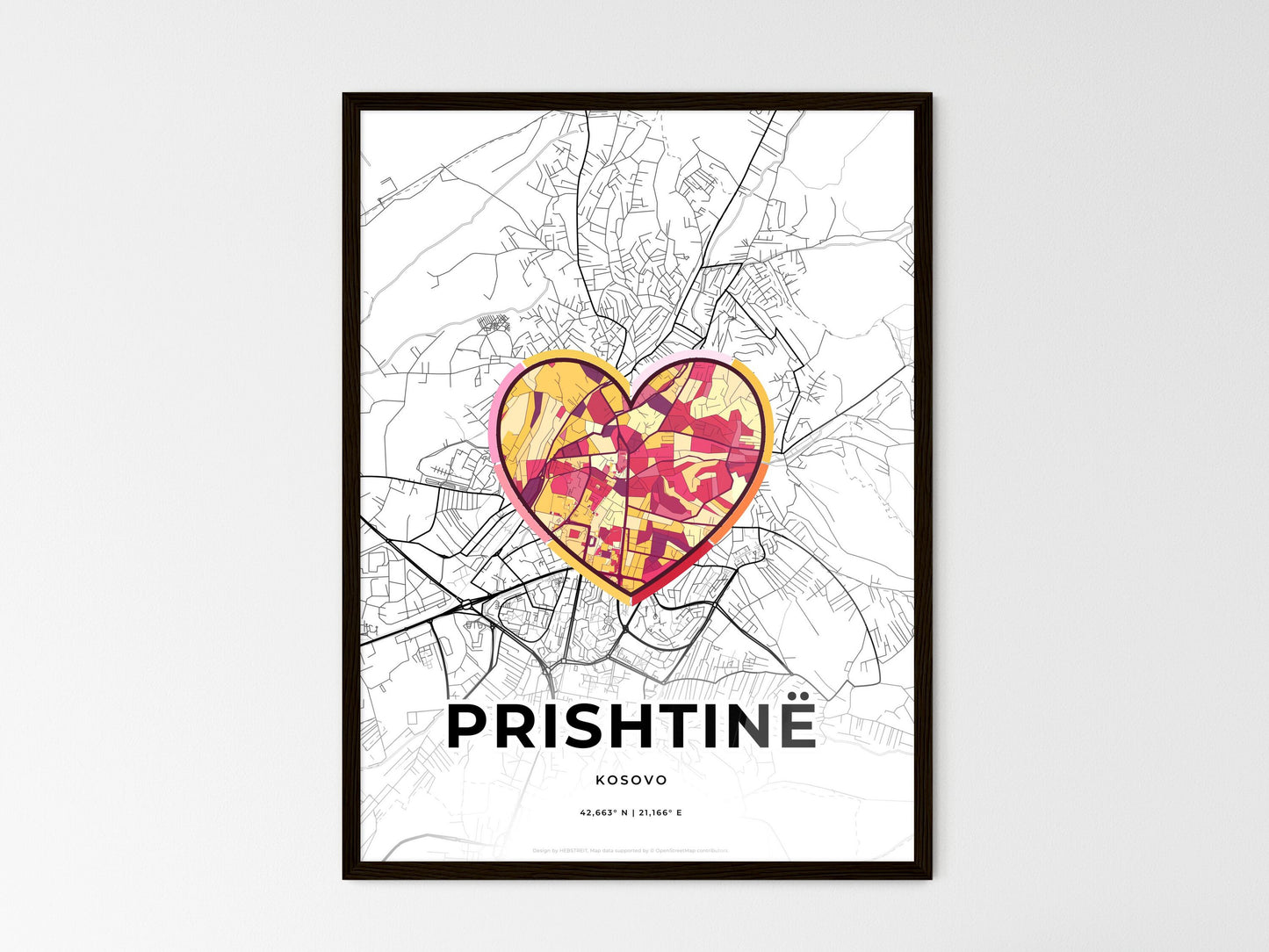 Immerse yourself in the vibrant energy of Prishtinë, the heart of Kosovo. This abstract city map is a captivating display of art and architecture, showcasing the city's eclectic spirit. The colorful icon adds a touch of whimsy, reminding you of the warm and welcoming nature of its people. Whether you're decorating your home or searching for a unique gift for a loved one with a connection to Prishtinë, this print will transport you to the heart of this dynamic and captivating city.