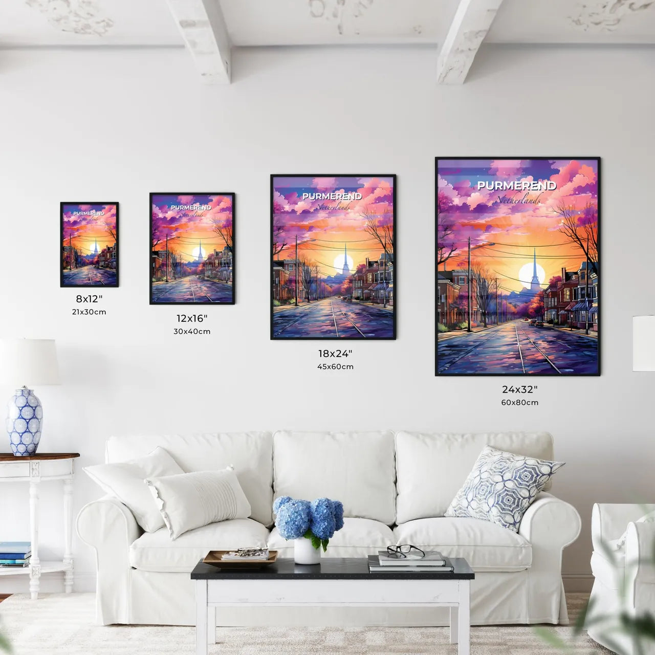 Purmerend, Netherlands, A Poster of a street with buildings and trees and a sunset