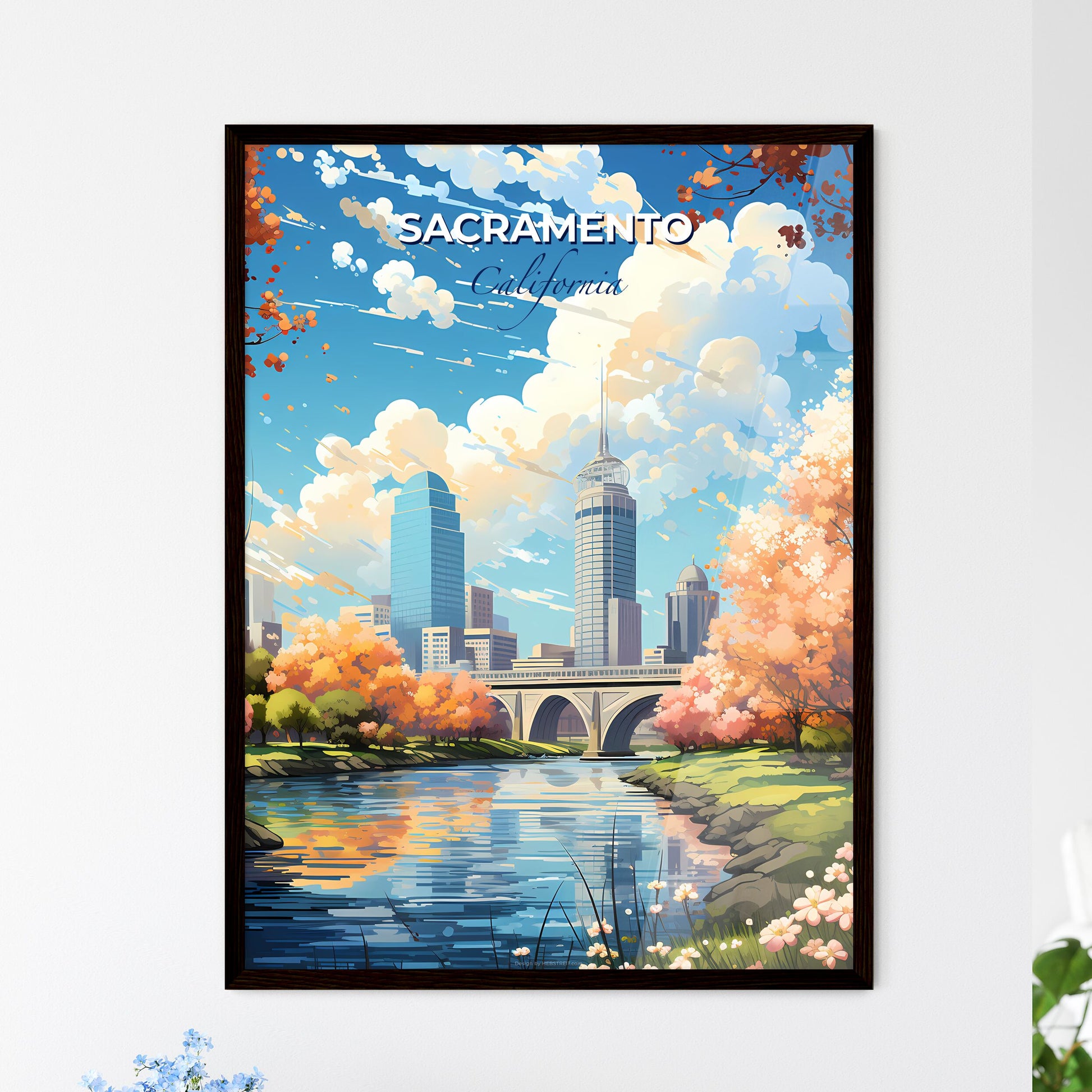 Introducing A Poster of Sacramento California Skyline - A River With A Bridge And Trees And A City In The Background our premium ART Print that captures the playful spirit and vivid imagination of modern art. This eye-catching series consists of vibrant urban views, each designed with a bold and expressive color palette that adds a touch of color and energy to any space.