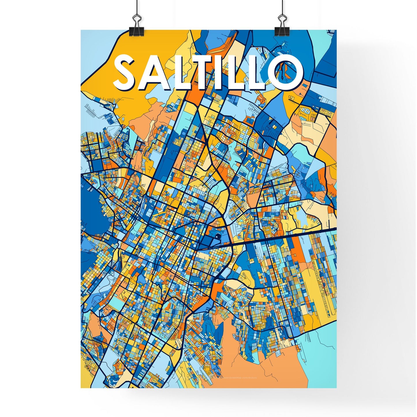 Bring a piece of Saltillo into your living space with this vibrant and modern city map poster. This custom-designed print features the urban layout of Saltillo, showcasing its streets, blocks, and surrounding geographical features in a beautiful array of colors that will add a touch of sophistication and urban charm to any room.