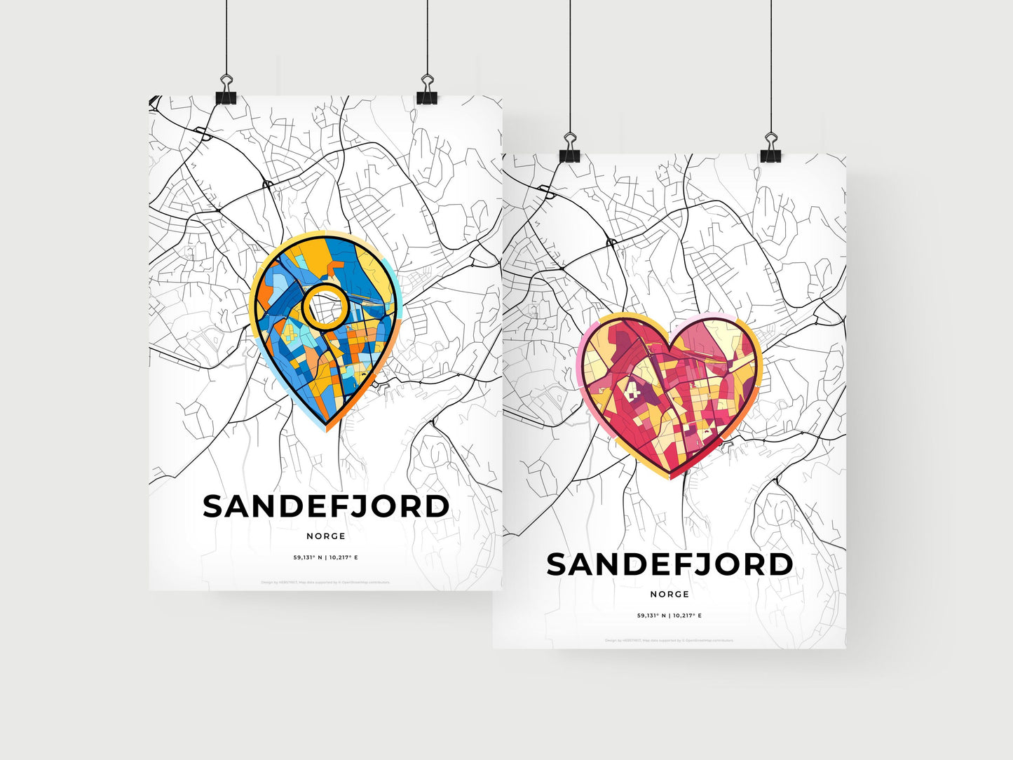 Our map of Sandefjord Norge shows minimalist designed roads, railroads and waterways combined with colorful urban areas within one icon.