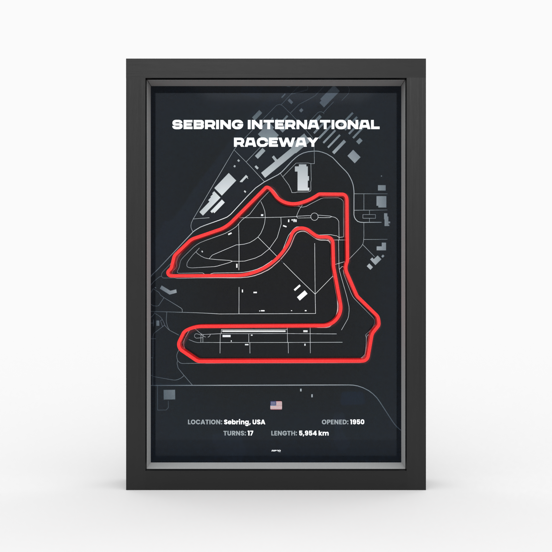 Der Sebring International Raceway gehört zu den traditionsreichsten und anspruchsvollsten Rennstrecken der USA. Bekannt für seine charakteristischen Kurven und unvergesslichen Geraden, hat die Strecke zahlreiche legendäre Rennen hervorgebracht – darunter das berühmte 12-Stunden-Rennen von Sebring. Unser 3D-Poster erfasst jedes Detail dieser Ikone des amerikanischen Motorsports und lässt die Faszination der Strecke in neuem Licht erstrahlen.
