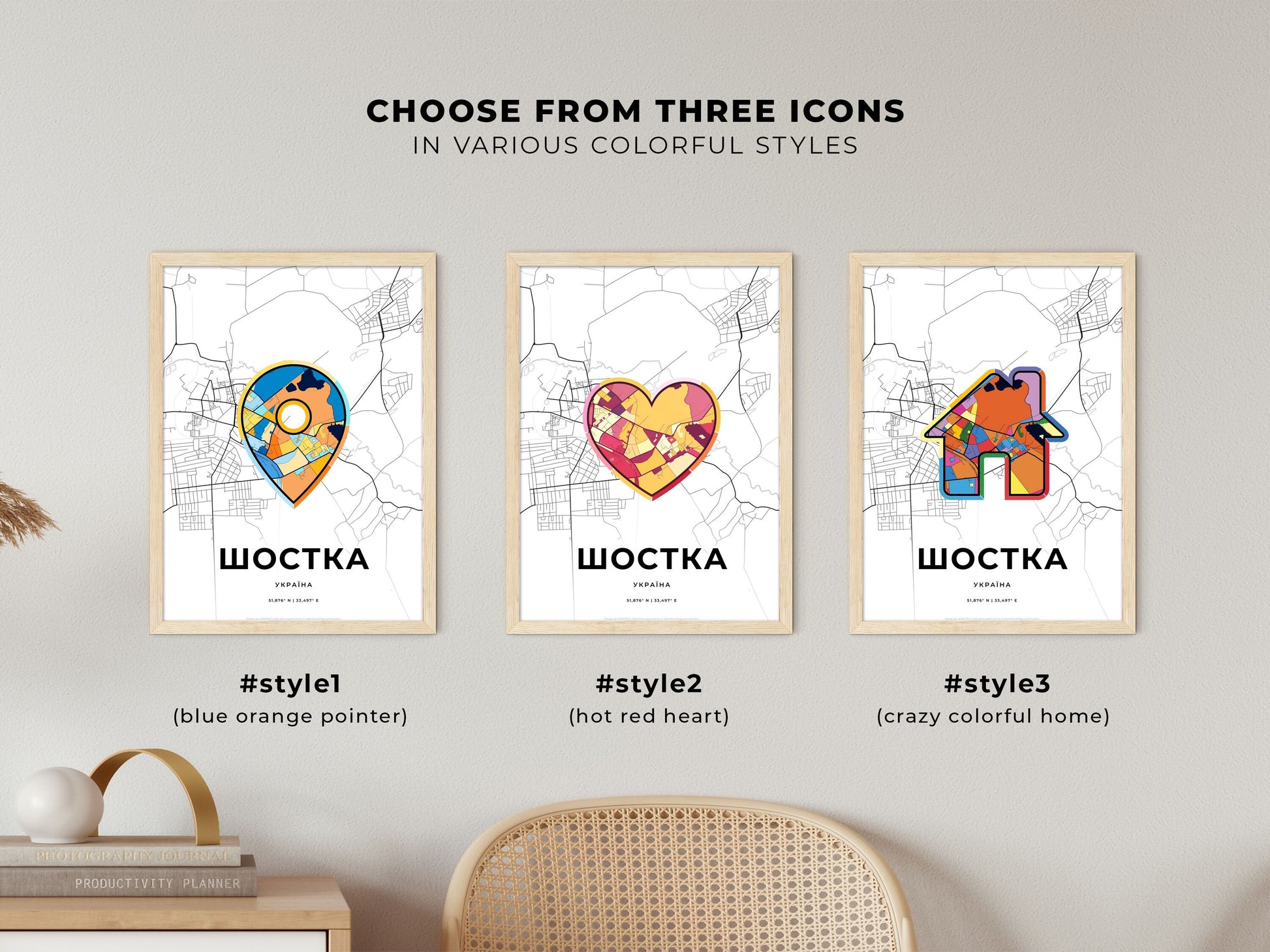 Immerse yourself in the captivating history of Shostka, Ukraine, with our vibrant city map. Situated in the heart of northern Ukraine, Shostka has been a hub for chemical and pharmaceutical industries since the 18th century. Today, it's a thriving city known for its rich cultural heritage. With a modern twist on traditional cartography, this artwork captures the beauty of Shostka. Its abstract lines and colorful iconography create a mesmerizing interpretation, perfect for adding a touch of artistic flair to your home or gifting to someone with a special connection to this fascinating city.