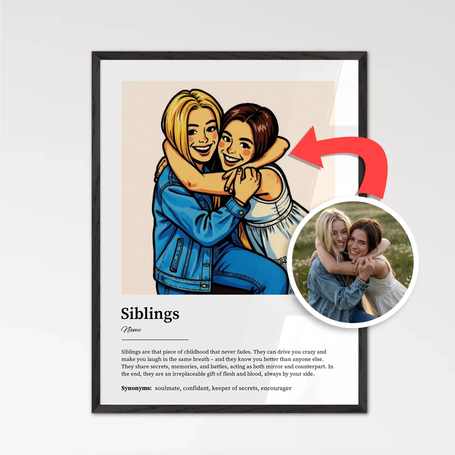 Upload your favorite photo and we’ll turn it into a vibrant illustrated portrait that captures the special bond between siblings. From shared laughs to quiet moments, each artwork celebrates what makes brothers and sisters unforgettable. Each print features a comic-style illustration of your photo, a heartfelt sibling quote, personalized names or details, and a timeless design made to look beautiful on any wall. A meaningful gift for birthdays, holidays, or simply to celebrate family love—more than art, a keepsake for life.