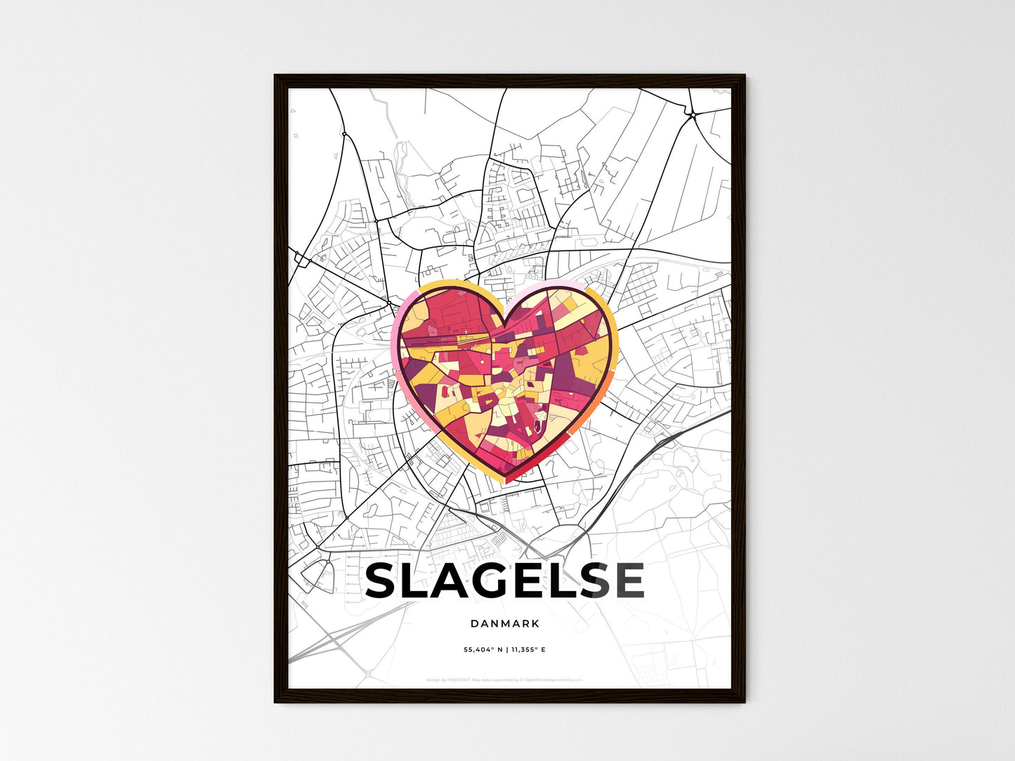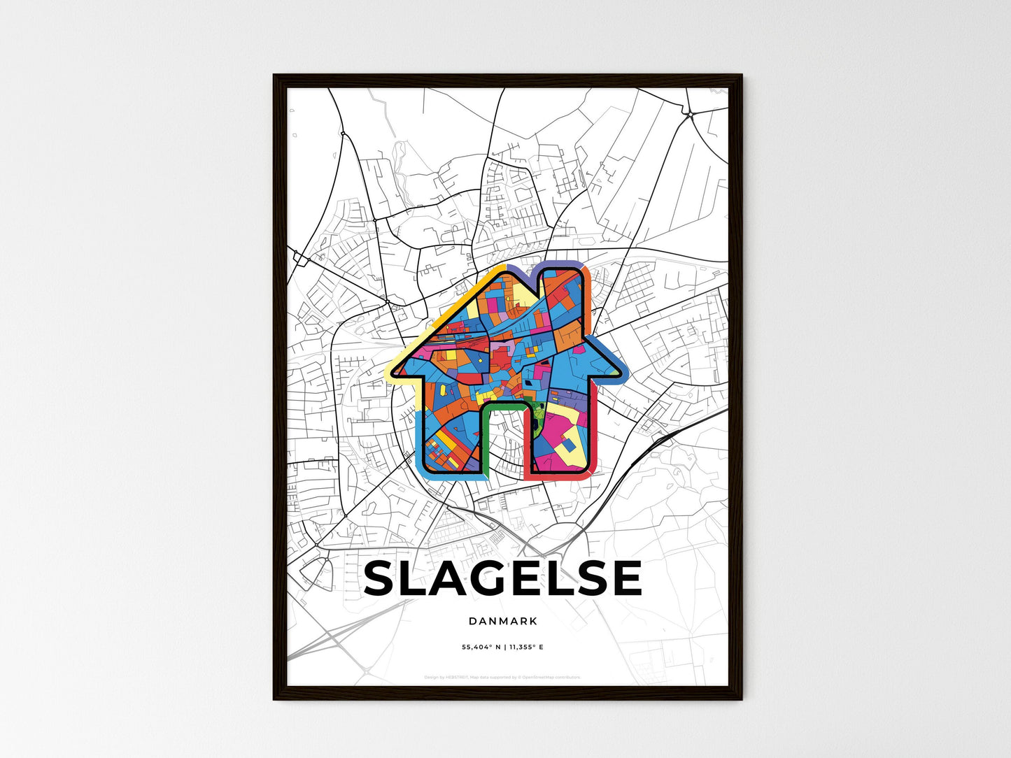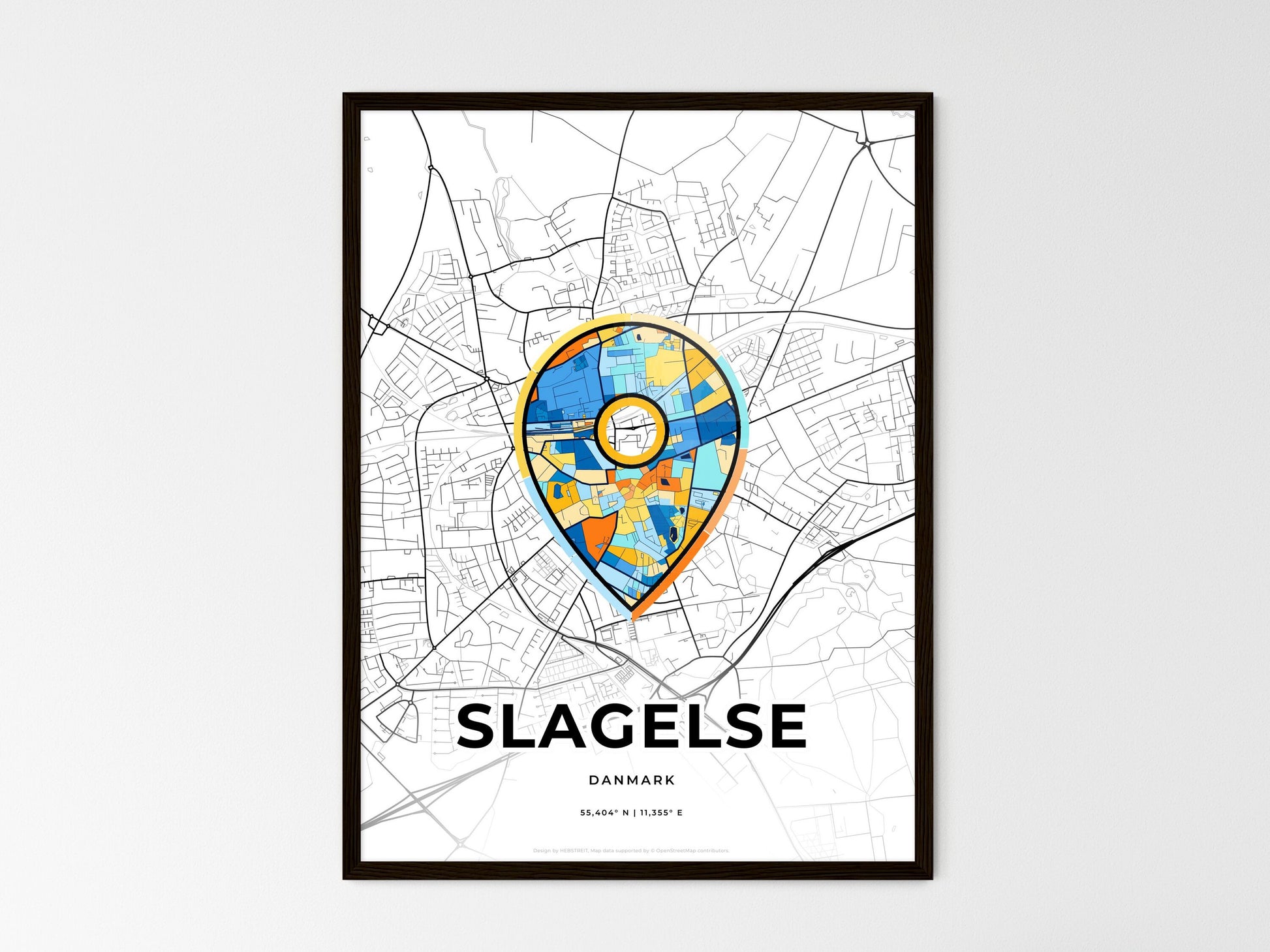 Our map of Slagelse Danmark shows minimalist designed roads, railroads and waterways combined with colorful urban areas within one icon.