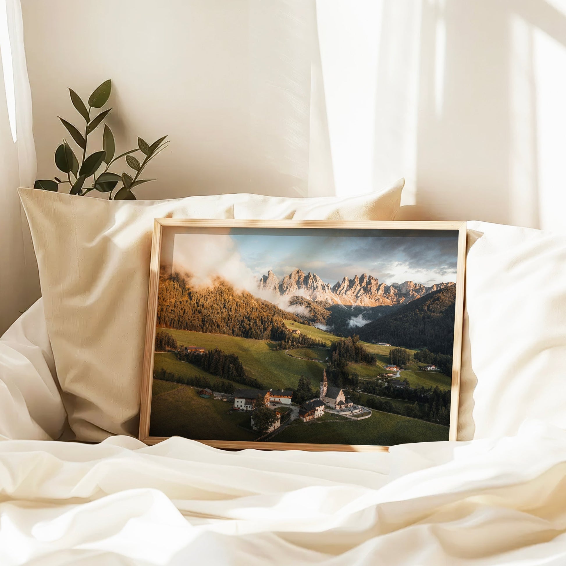Bring the calm beauty of the Italian Alps into your space with this fine art photography print of St. Magdalena in the Dolomites. Captured at sunrise, the jagged Odle peaks glow above a misty green valley, where a historic church anchors the peaceful alpine village. Printed on museum-quality matte paper, this piece features rich detail and soft tones – perfect for cosy interiors, nature-inspired homes, or mountain lovers.
