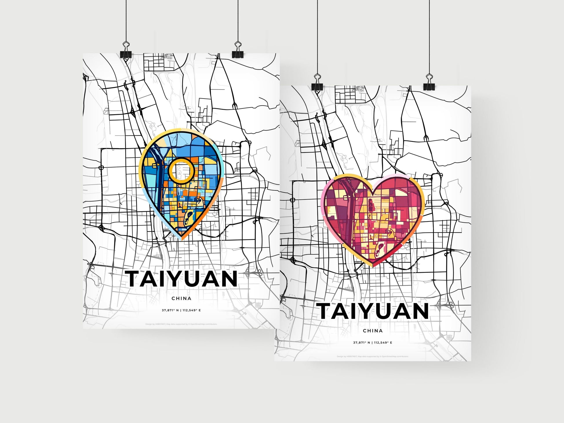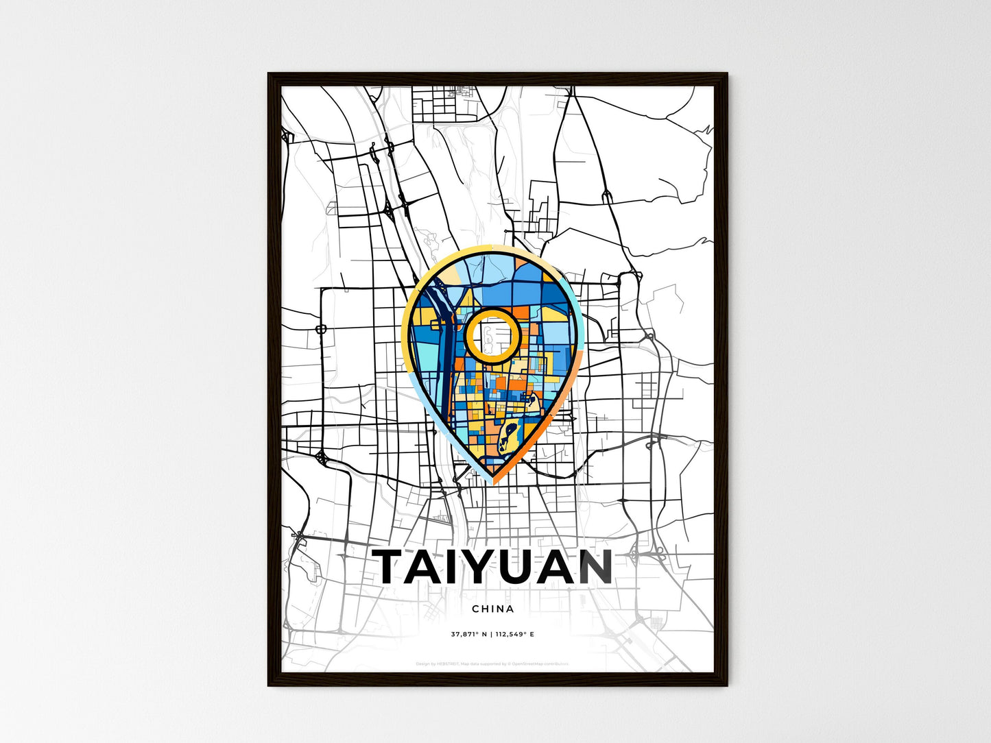 Discover Taiyuan, China through this vibrant city map illustration, perfect for the curious traveler or urban art enthusiast. Immerse yourself in the ancient history and modern energy of this city where it all began. The abstract design captures the essence of Taiyuan's vibrant culture and pivotal role in Chinese history. Whether you're a visitor, former resident, or simply captivated by its charm, this print serves as a stunning reminder of the city's unique allure and enduring spirit. Order it as a meaningful gift or add it to your own space to bring a touch of Taiyuan's vibrancy into your home.