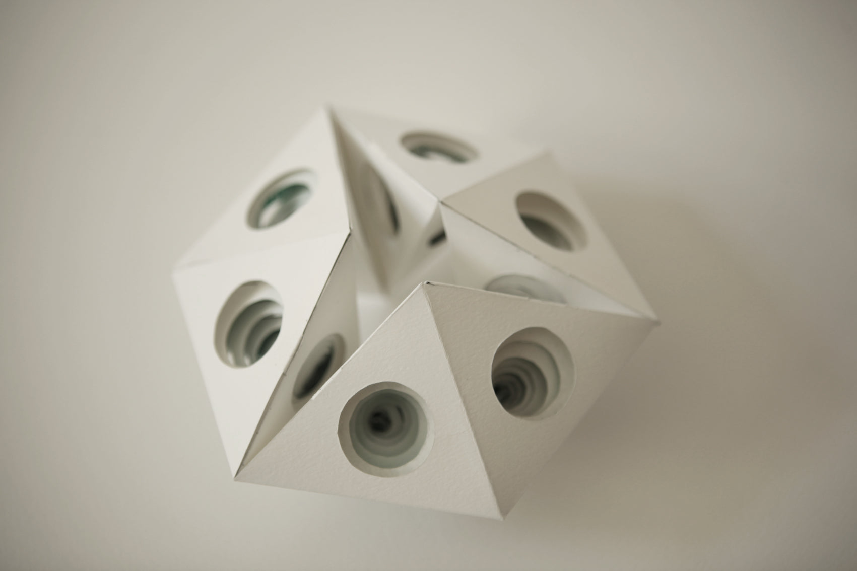 Katharina Kamph's Timaios serves as a direct reference to Plato, who provides the first description of the Platonic solids in the creation myth Timaios. The protagonists Timaios, Socrates, Kritias and Hermokrates philosophise about the origin of the world. In his lecture on natural philosophy, Timaios explains why the cosmos is shaped by two factors: reason and necessity. Since God must have created the cosmos optimally, the nature of the world is made up of four fundamental elements, whose ultimate symmetry and thus beauty imperatively explain their existence.