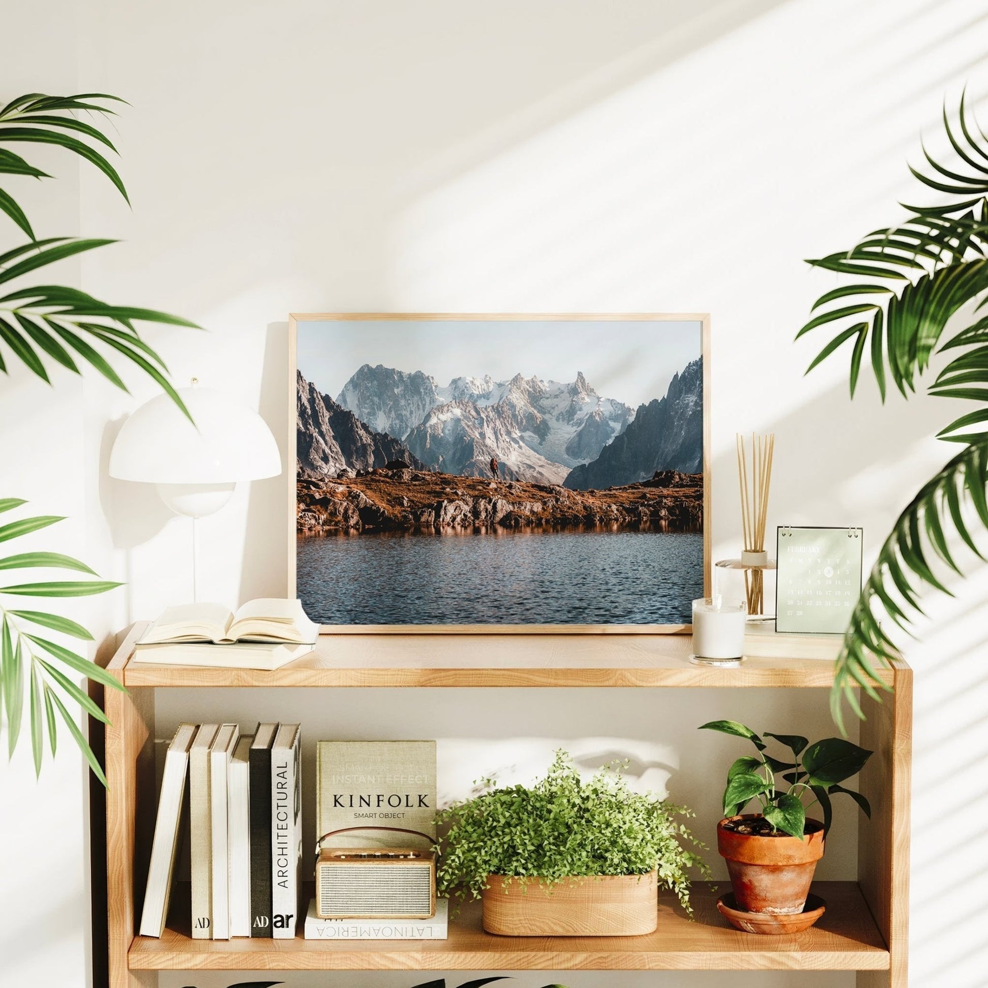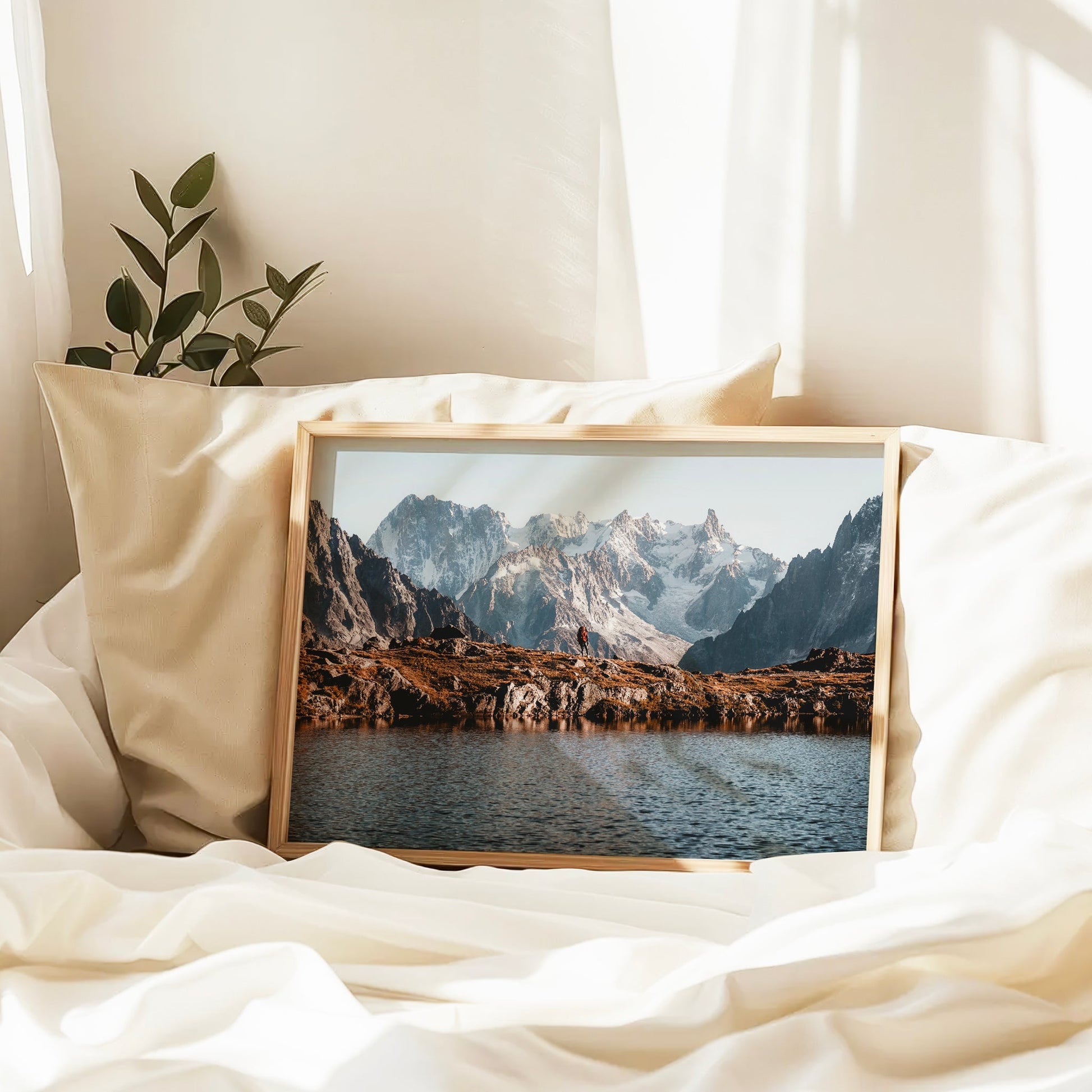 Bring the beauty of the Alps into your home with this stunning wall art print featuring a hiker on the Tour du Mont Blanc. Capturing serene mountain reflections and dramatic peaks, this artwork is perfect for nature lovers and adventure seekers. A timeless addition to any space, showcasing Chamonix’s iconic alpine beauty.
