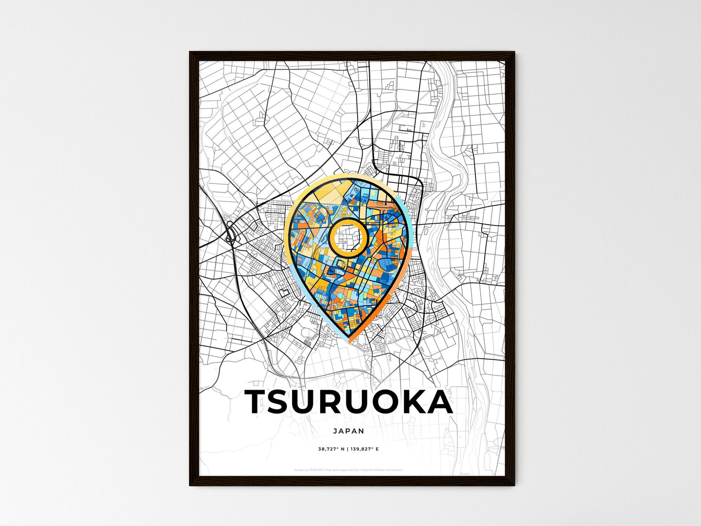 Our map of Tsuruoka Japan shows minimalist designed roads, railroads and waterways combined with colorful urban areas within one icon.