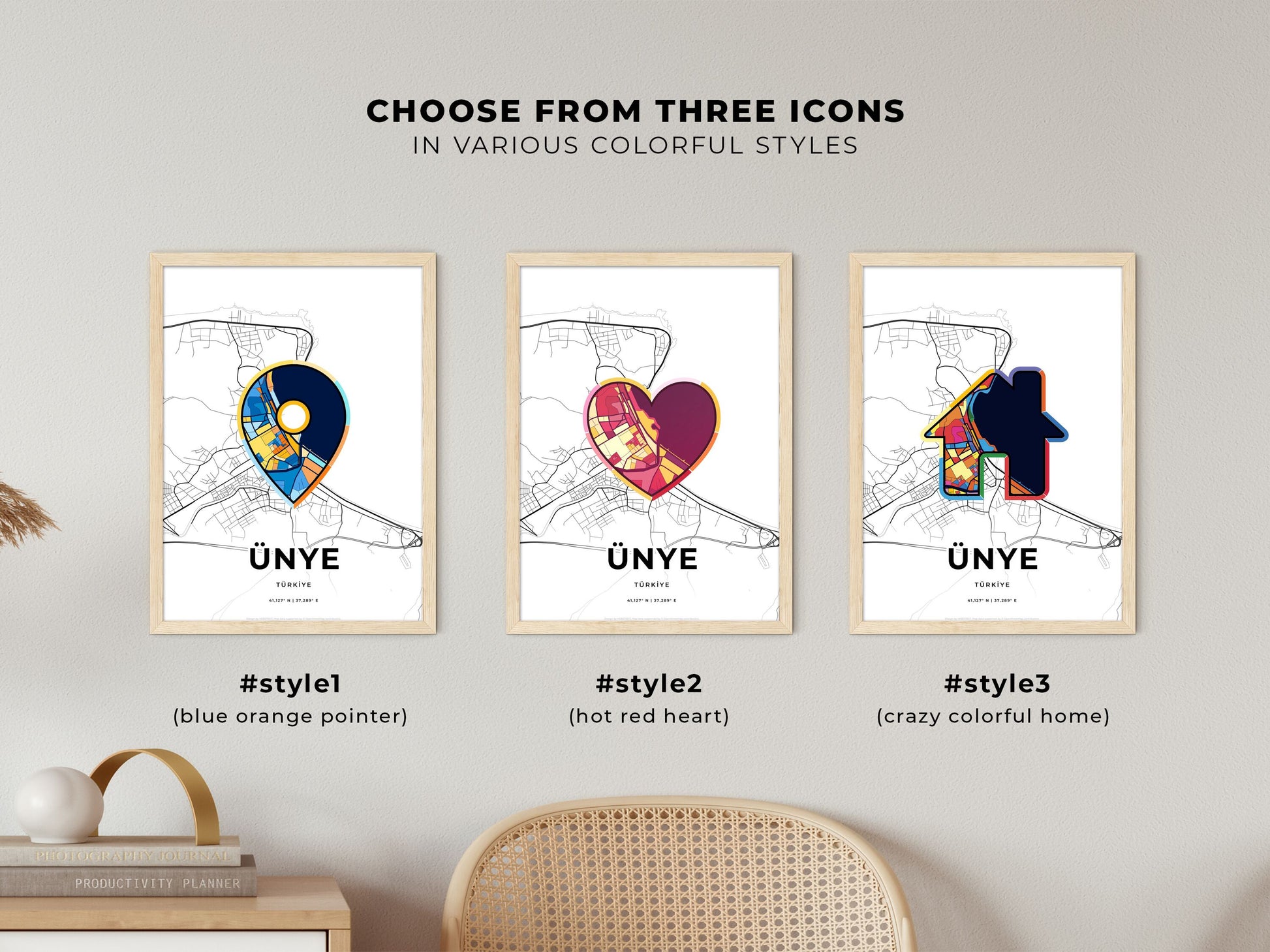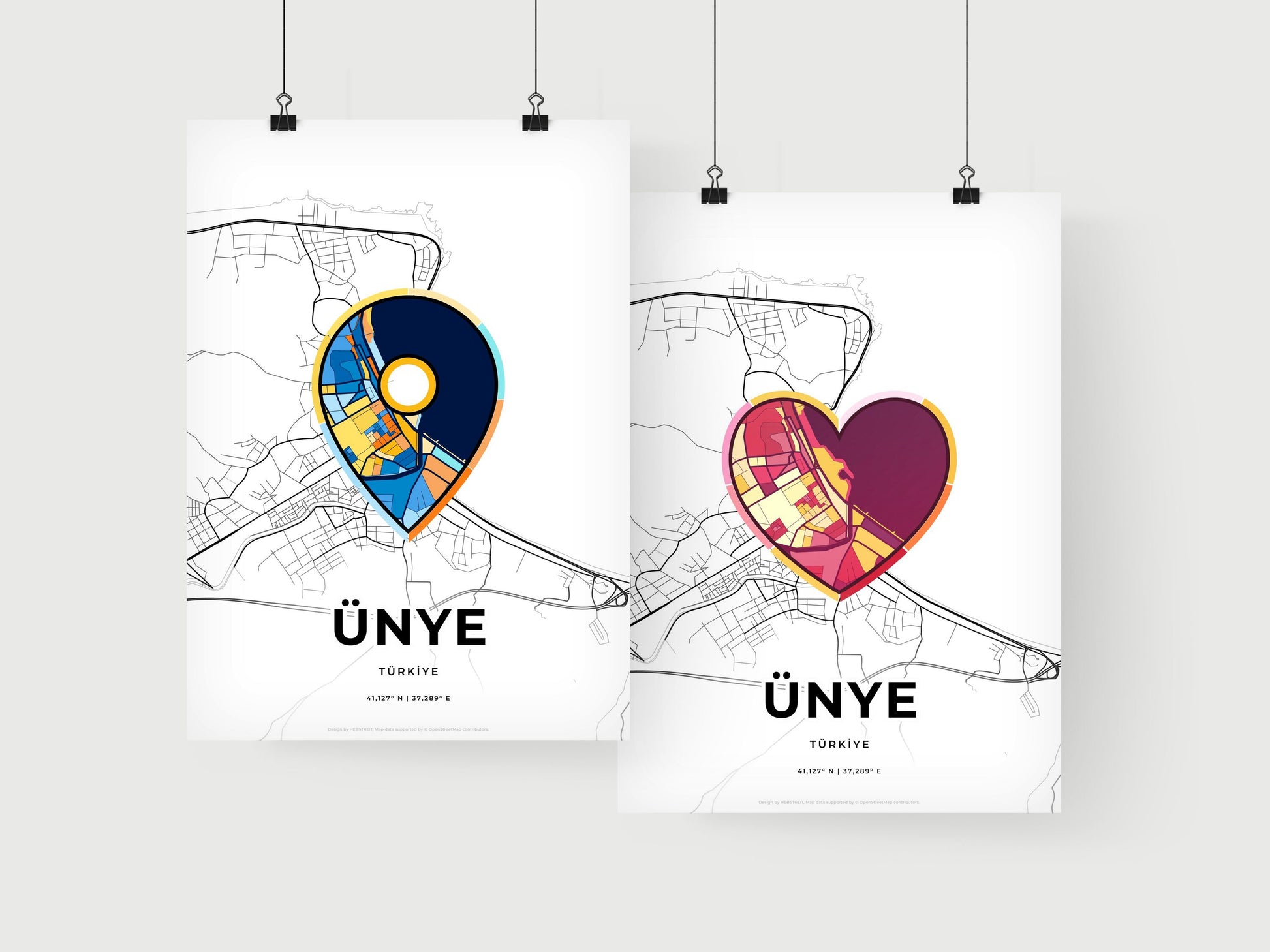 Our map of Ünye Türki̇ye shows minimalist designed roads, railroads and waterways combined with colorful urban areas within one icon.