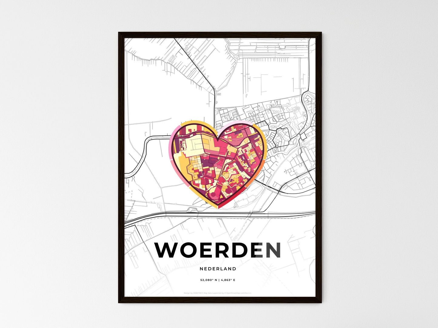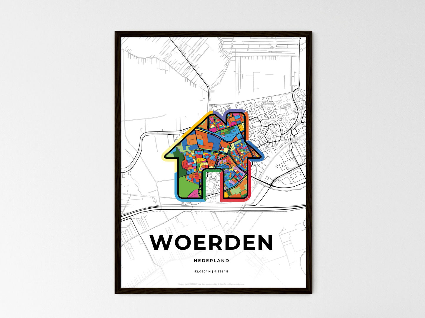 Our map of Woerden Nederland shows minimalist designed roads, railroads and waterways combined with colorful urban areas within one icon.