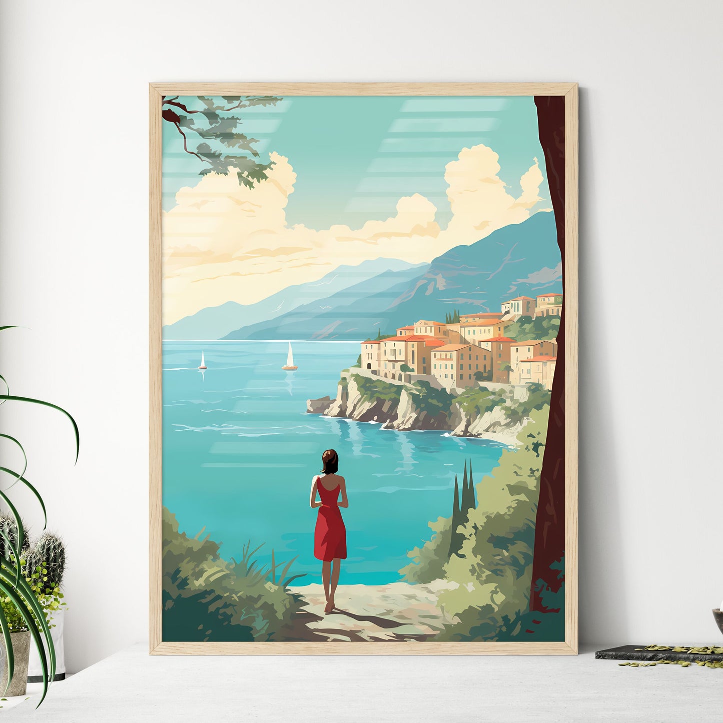 This captivating art print showcases a striking portrait, capturing the enigmatic essence of a woman gazing upon a distant town perched atop a towering cliff overlooking a serene body of water. The expressive brushstrokes and muted tones evoke a sense of introspection and mystery, inviting the viewer to contemplate the subject's thoughts and emotions. The harmonious composition and skillful use of light and shadow create a powerful visual impact, making this print an ideal addition to any art lover's collection or as a thoughtful gift for someone who appreciates the beauty of both art and nature.