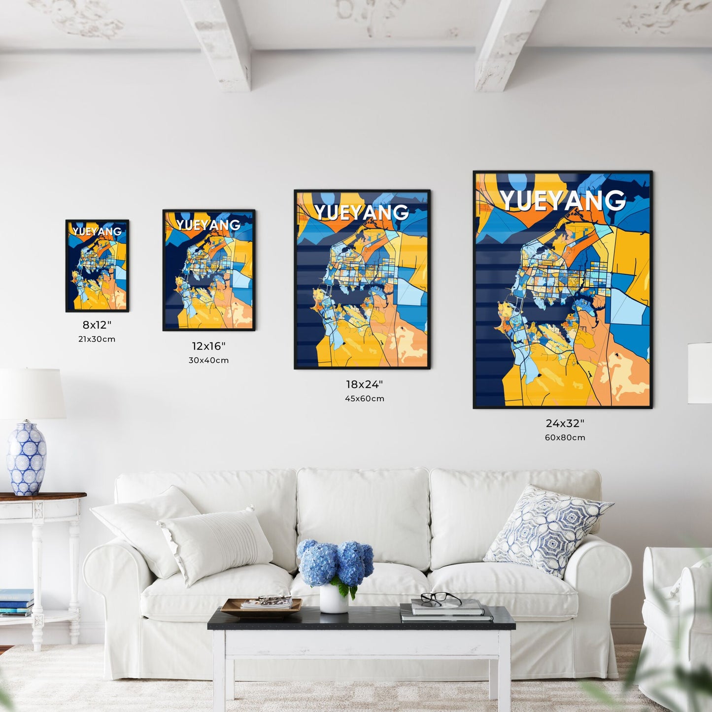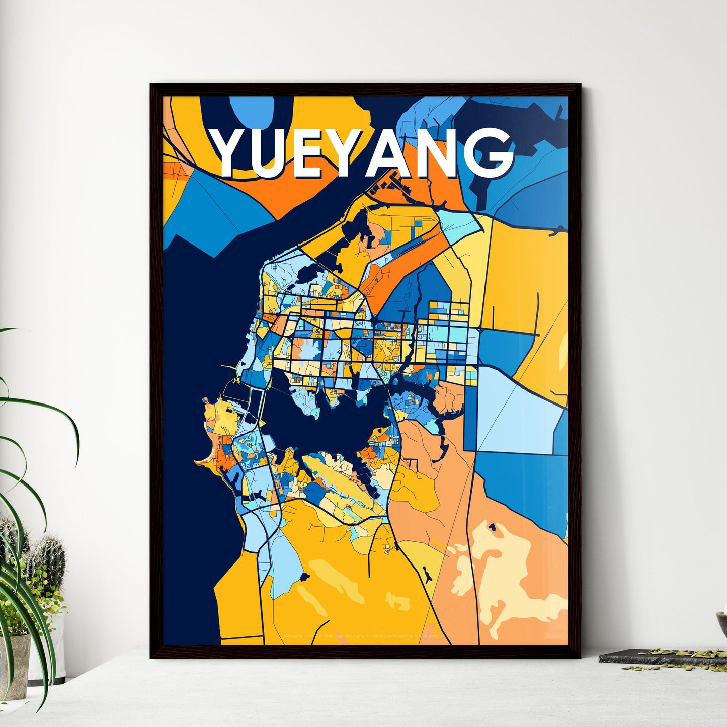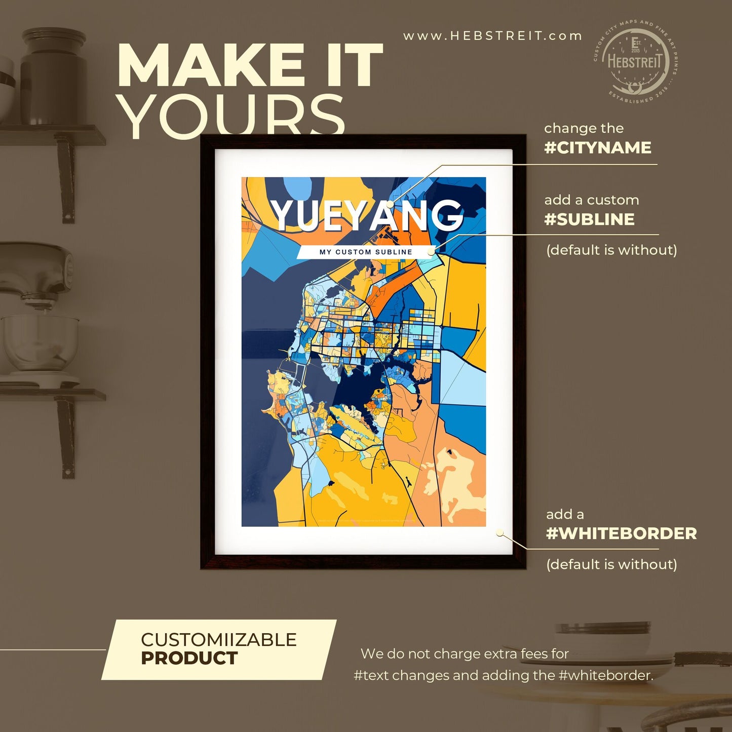 Crafted with a keen eye for detail, this map includes the major thoroughfares and neighborhoods, highlighted with a striking color palette of blues, oranges, and yellows that contrast sharply against the dark blue representing the adjacent water body. The city's name YUEYANG is prominently displayed in bold, white lettering at the top, making it an unmistakable tribute to this beloved location.