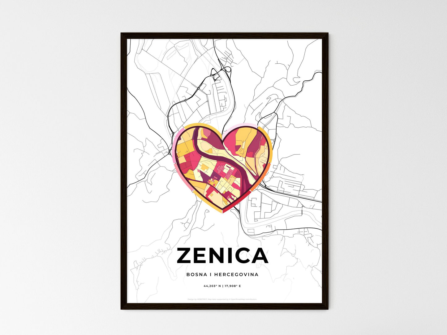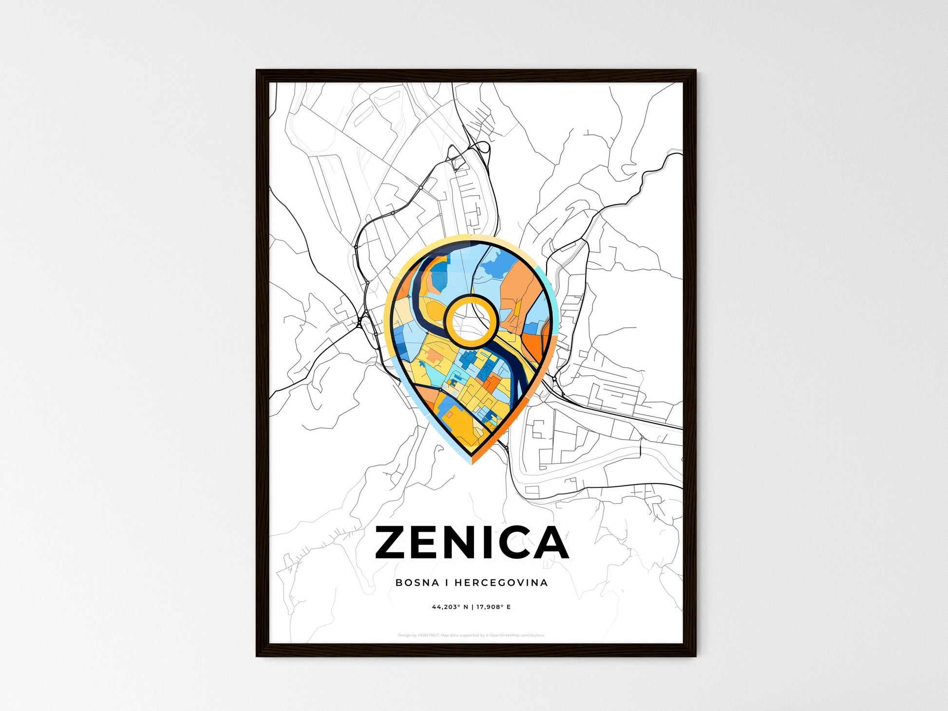 Uncover the vibrant tapestry of Zenica, Bosnia and Herzegovina, through this minimal art map. Amidst the rolling hills and crystal waters of central Bosnia, Zenica stands as a testament to the rich heritage and modern spirit of this captivating region. Once a bustling industrial hub, Zenica has transformed into a thriving economic and cultural center, boasting a vibrant arts scene, charming cafes, and historic landmarks. Its colorful icon symbolizes the city's enduring charm and the warmth of its people, making this map a perfect memento for those who hold Zenica close to their hearts or a delightful way to add a touch of Bosnia's rich tapestry to any home.