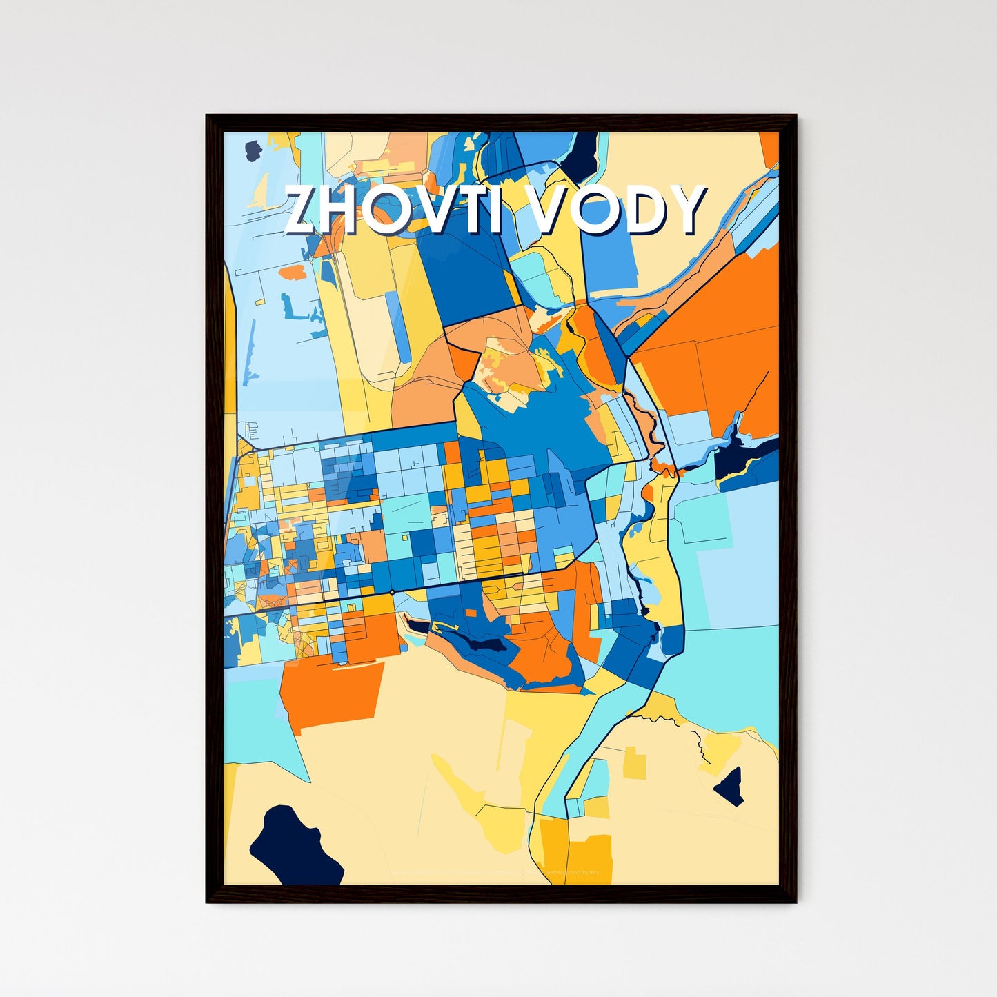 Crafted with a keen eye for detail, this map includes the major thoroughfares and neighborhoods, highlighted with a striking color palette of blues, oranges, and yellows that contrast sharply against the dark blue representing the adjacent water body. The city's name ЖОВТИ ВОДИ is prominently displayed in bold, white lettering at the top, making it an unmistakable tribute to this beloved location.